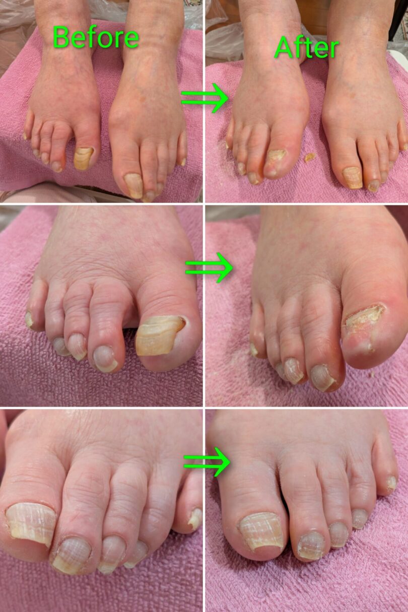 足浴で洗浄と爪を柔らかくしてからグラインダーで厚みを取り、長さの調整をしました。